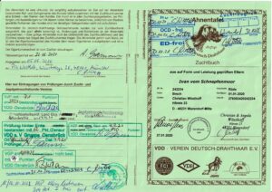 Zuchtbuch-Nr. 234946, Farbe: schwarzschimmel, Form: sehr gut (9), Haar sehr gut (11), Höhe 68 cm, Länge 71 cm, HD-, ED, OCD-frei, VJP 77 Pkt., Hegewald 206 Arbeitspkt./ 216 HW-Pkt., VGP Üf. 300/ II. Preis, BP Brbg. A und E, HN, Btr, spur- und sichtlaut